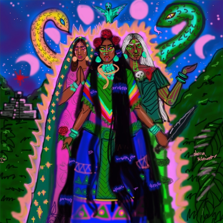 Another poem dedicated to a deity. As a follower of La Virgen De Guadalupe, I have dug into Her history, and found Aztec/Mexica creator and destroyer goddess Coatlicue and mother goddess Tonantzin behind La Virgen, since La Virgen is arguably a colonization project that many people have reclaimed. Although, I am having a hard time figuring out if they are always one and the same. Tonantzin is the title of “mother,” and Coatlicue is a name that means “serpent skirt,” and they seem to be used interchangeably in my research.