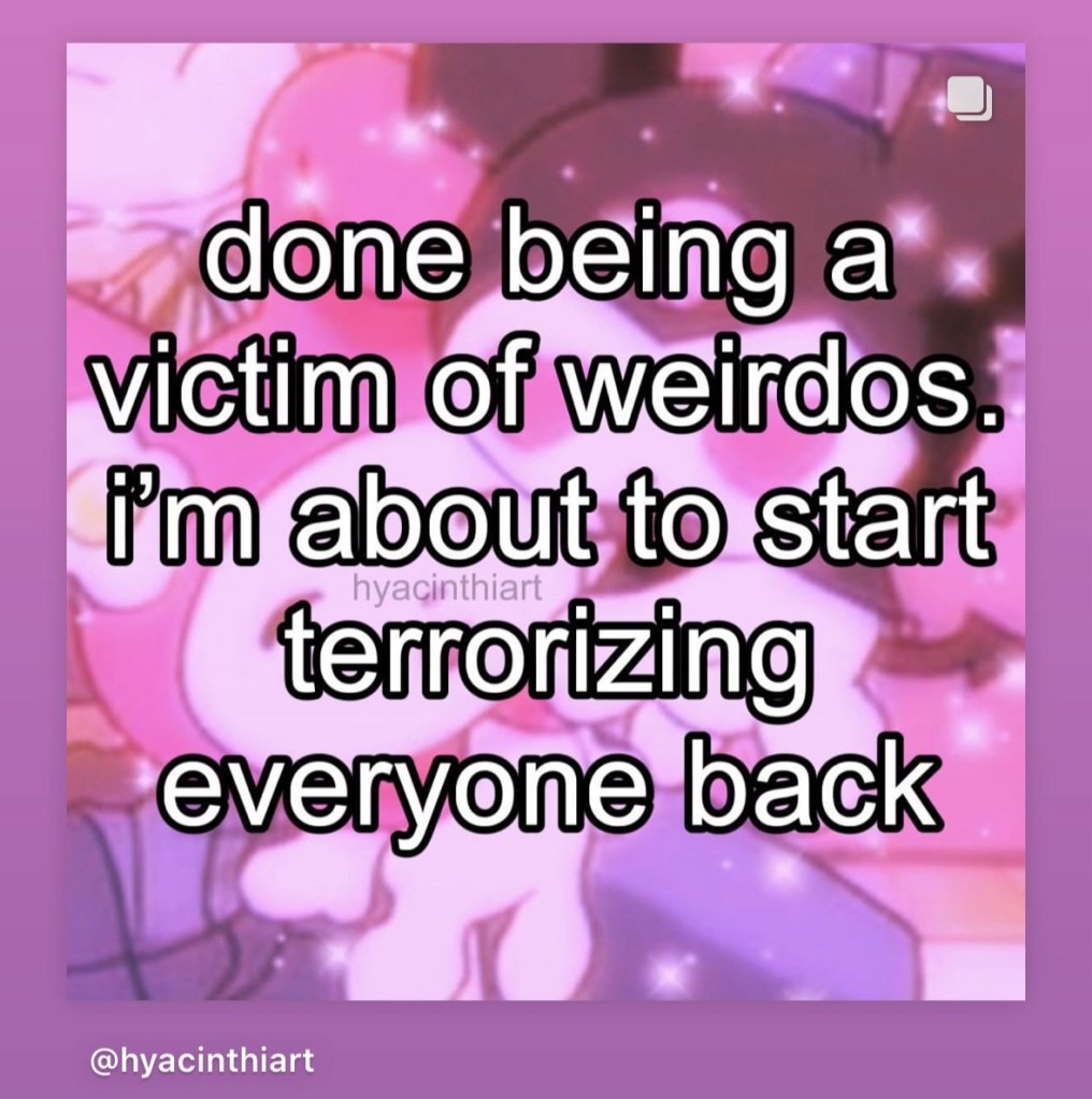- “I think about you everyday because you like to be a menace on dating apps and sometimes I’m too nice but then I think ‘it’s time to be a menace’” – me to my inspirational Menace