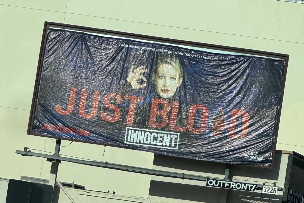 - Y’AAAAAAAAAAAAAAAAAALL LOOK AT THIS FUCKIN BILLBOARD TRYING TO CLAIM ELIZABETH HOLMES’ INNOCENCE!!!!! I went on the website (justblood.com) but I’m not sure I should advise you to do the same. Sketchy, and not just for what it’s advetising.