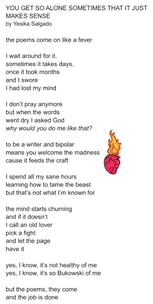 - “to be a writer and bipolar / means you welcome the madness / cause it feeds the craft” – Yesika Salgado