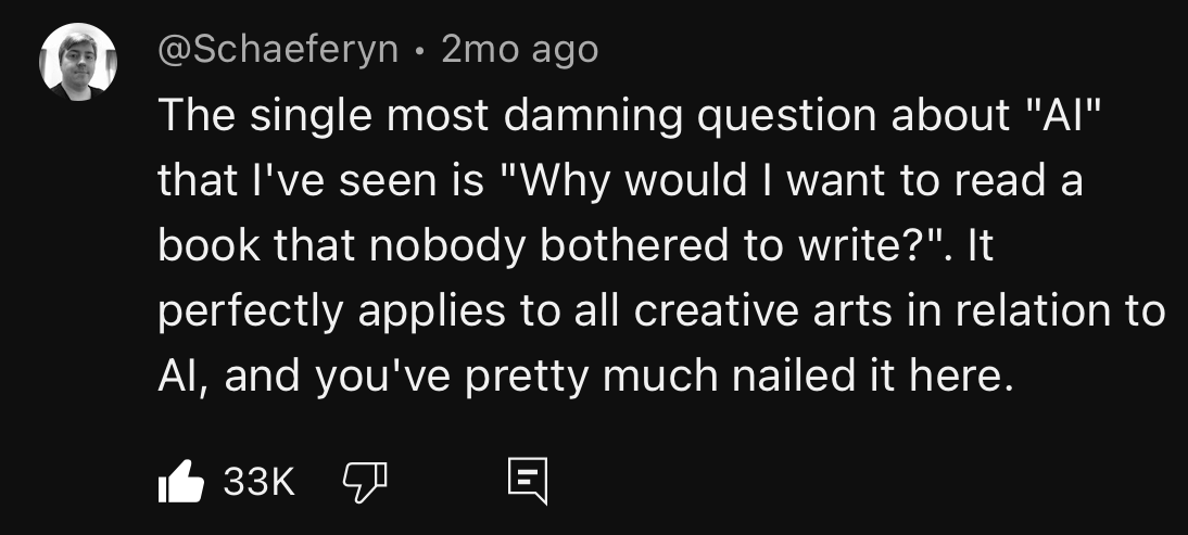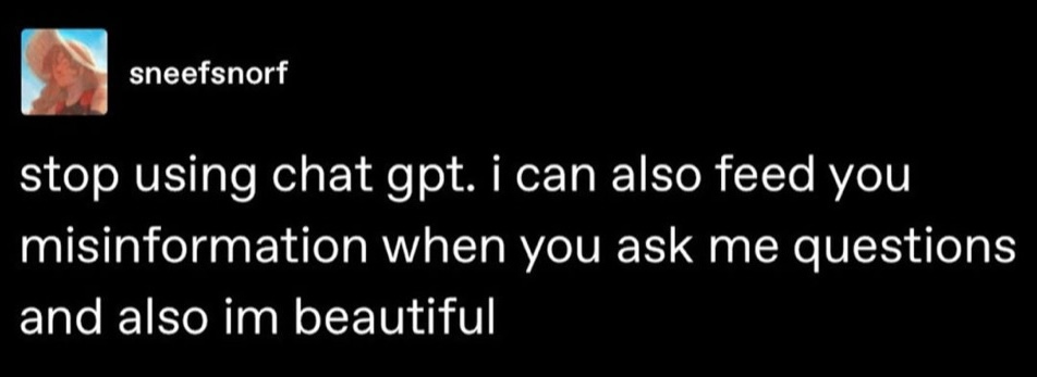 - “You could have AI do that for you” – my father, the man who’s favorite movie is The Matrix (1999), which (spoiler alert) warns AGAINST AI!!!!