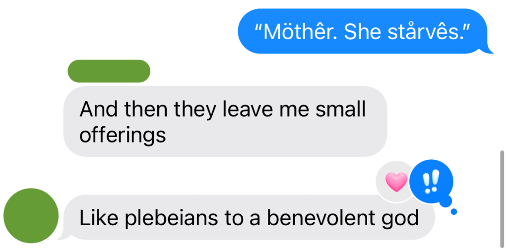 I’m including this one because of a couple of other points I make in the following sections. In the process of writing this one, I realized that the point of relationships is for them to be satisfying work. This piece is focused on a romantic relationship, but is also true of platonic relationships. Previously, I have tried to maintain some friendships because the person was nice to talk to, but the relationship was not satisfying; it was not reciprocal, and/or we just didn’t match/vibe. (Note: capitalism has made us weary of work but that’s because we’re overworked. But we do like to work – we don’t like being bored for too long, if at all.) “Love is for the ones who love the work” – Joseph Fasano, his poem is in the Special Edition section.